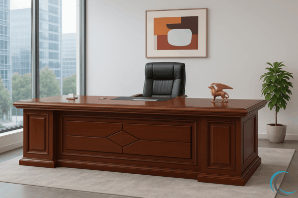 Add timeless prestige to your workspace with the 1.8m-Executive Wooden Office Desk – Premium Mahogany Finish. This commanding desk blends classic craftsmanship with functional design, ideal for high-level executives who value elegance and performance. Its deep mahogany gloss, decorative center panel, and glass-accented pillars create a refined presence in any corporate environment.